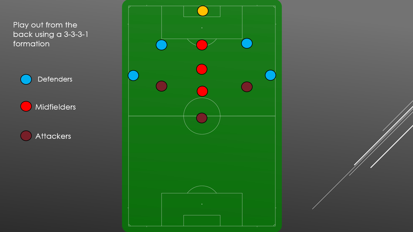 We also set out to make a conscious effort to try and play from the back and make everyone feel confident in possession. I spent some time over the summer studying several elite coaches by reading analysis blogs, coaching books and watching football, and I liked the idea that Marcelo Bielsa has used historically which is that of a 3-3-3-1 on goal kicks (Shown below). This was presented to the players, and the idea is that the 2 Centre Backs split towards the corners of the area, the holding midfielder drops in around the D of the area, with the Full Backs pushing up and hugging the touchline. The 2 Central midfielders divide themselves so one pushes forward in support of the Centre Forward, with the other one dropping back and being the link player. The wingers then come into the pitch to become narrower and to try and cause confusion for the defenders.