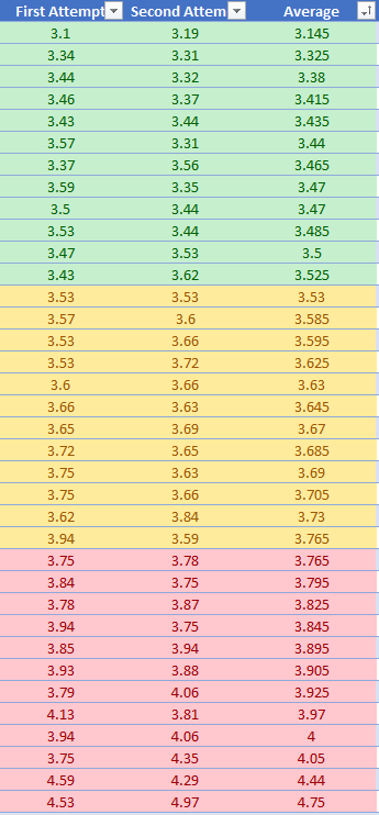 The second stage of the physical testing was around speed. Scott had found some SPARQ testing sheets for football, so we took the 20-yard sprint test from that, and measured each candidate over that distance, with them performing this test twice. The trialists weren’t sifted from this immediately, as there was a lot of data, so the information was input into a spreadsheet on Excel, and then each trialists average speed was found out. From this they were then divided into 3 groups, Quick, Average, Below Average as shown below. (Includes week 2 trialists)