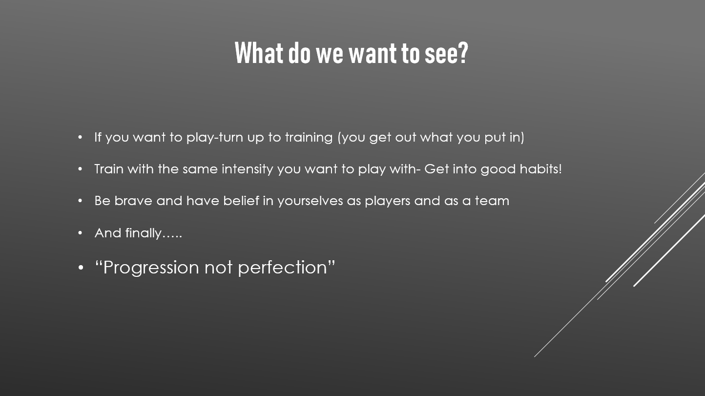 We felt last season that training performances were poor from the players, but we believed that was partly down to us both being new and not organising our sessions as well as we would have liked. We knew in the summer that we would plan all sessions properly over the weekend prior to training and that each session would have specific targets and goals that we wanted to hit in terms of developing this playing philosophy. Therefore because we were doing this, we asked for the players to improve their performances in training and to train with the same intensity that they would play a game with. The points were basic, but we wanted to see improvement from last season, which was outlined by the very cliche “Progression no Perfection” bullet point that was used.